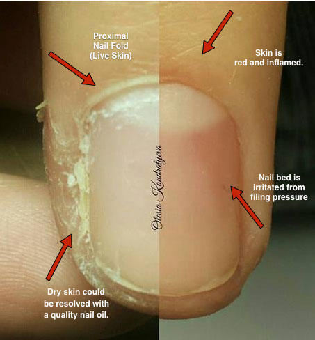 Many people who use this nail preparation technique place nail coating products directly onto or up against the damaged skin. This also drastically increases the client’s risk for adverse skin reactions.