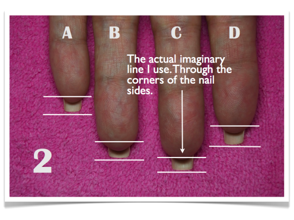 Now look at the tops of your fingertips and the top line you just filed on your nail. I use an imaginary line as in finger C in photo #2.