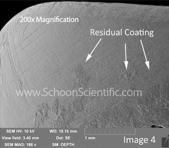 Image 4 is a nail magnified almost 200 times to show a surface scattered with islands of UV nail color coatings which were not properly removed.