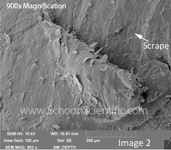 Look closely and you’ll see where a wooden pusher created the wide gouges leading up to these damaged areas that range in size from one half to twice the thickness of the human hair and smaller.