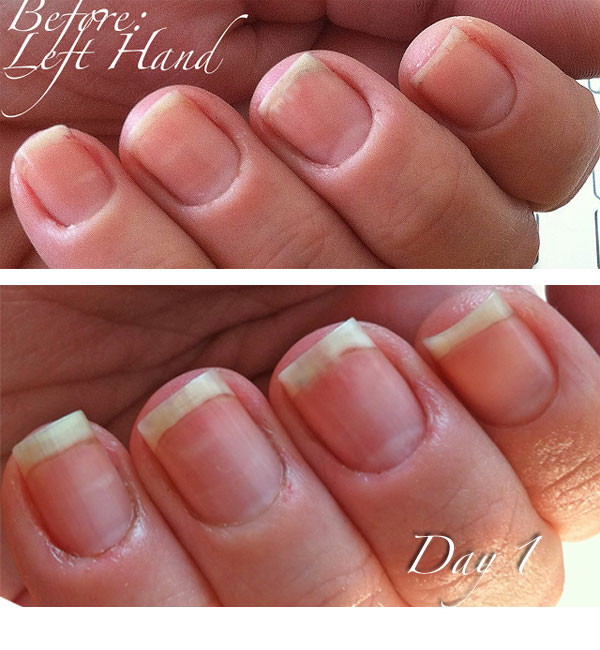 KIMBER 11:18 am: Here are the Day 1 photos! The improvement is amazing to me. It may not look like much to anyone else, but I can see a HUGE improvement! And my nails and cuticles feel amazing. I wish I had a naked photo of my right hand. The nails are so much whiter and brighter. This stuff is “Liquid Gold,” I tell you. I will never ever be without this.